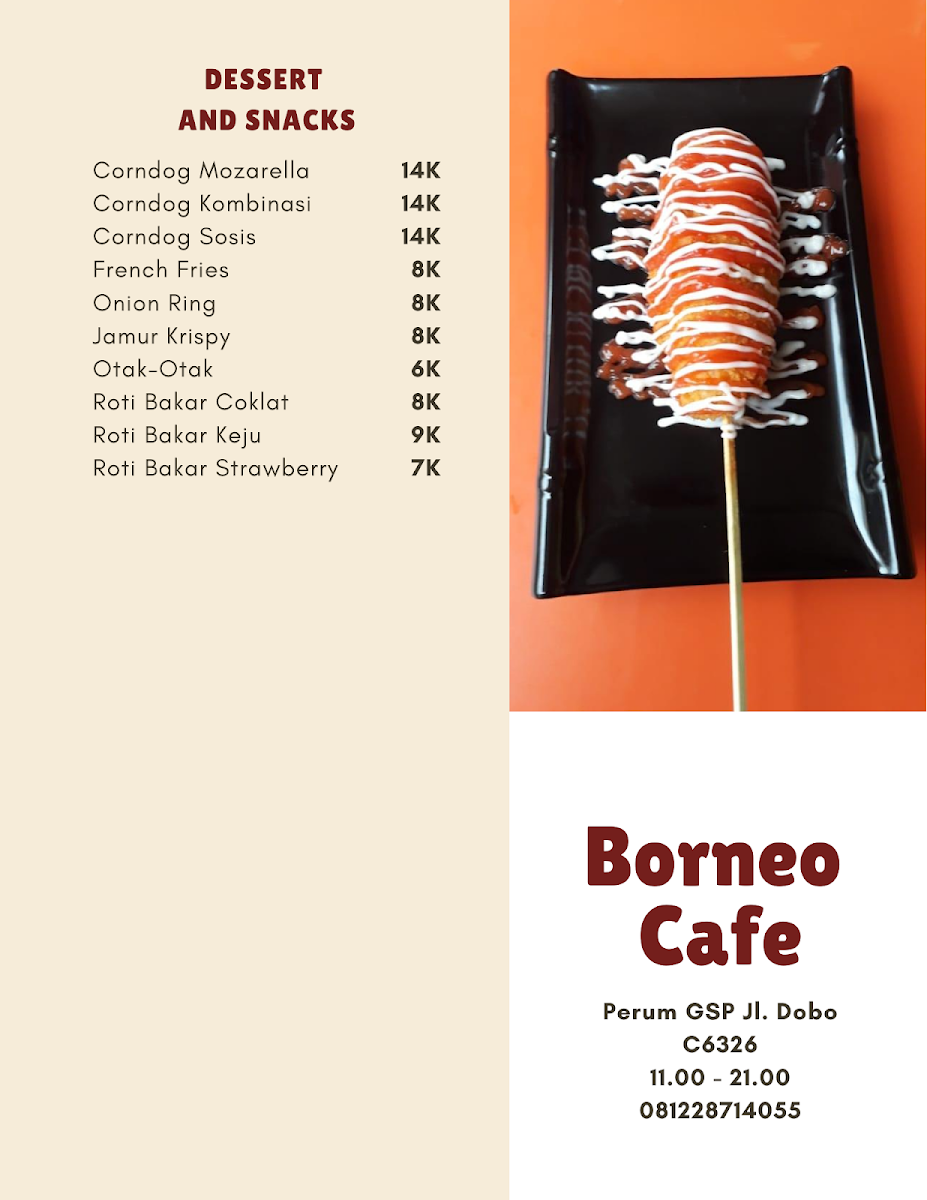 Welcome to Cafe Borneo, a charming cafe nestled in the heart of Cilacap, Indonesia. Located on Jl. Dobo, this cozy spot offers an inviting atmosphere that pairs classic decor with a refreshing ambiance, perfect for unwinding. Customers rave about their signature Corndog Mozarella, a must-try delight that leaves taste buds craving more. The combination of crispy exterior and gooey mozzarella creates a satisfying experience that's hard to resist.